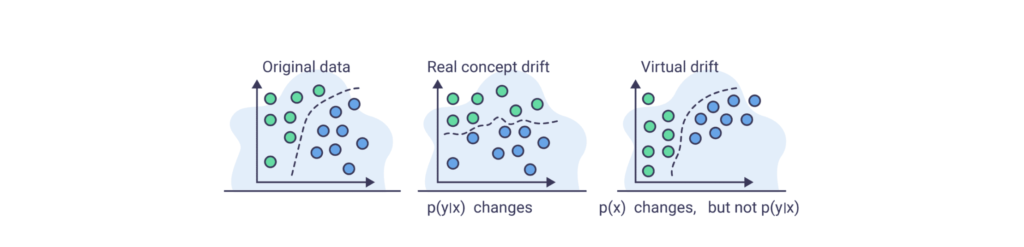 - コンセプトドリフト: モデルが学習した予測対象の本質や関係性が変化すること。