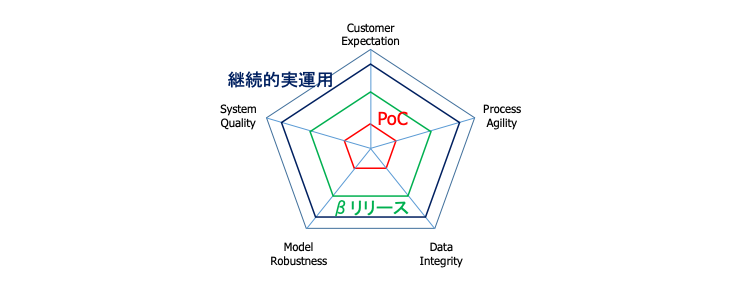 - 開発段階に応じた要求レベルの調整: AIプロダクトの品質評価において、開発の各段階で異なる要求レベルを適用することも重要です。例えば、プロトタイプ段階では迅速なフィードバックループが求められるため、Process Agilityの評価に重点を置きます。一方で、運用段階に入ると、System QualityやCustomer Expectationの評価がより重要となります。このように、各評価軸の重要性を開発段階に応じて調整し、適切な品質管理を行うことが、最終的なプロダクトの成功につながります。