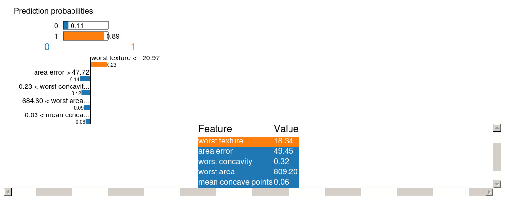 住宅価格の回帰モデルと同様に、全体のデータの80%を学習データとし、残り20%を評価データとします。評価データのindex=0(分類で悪性と予測する確率値:0.889238)について、LIMEおよびSHAPで可視化を試みてみます。また、LIMEにおいては何個の変数を用いて可視化するかを選べるため、今回は=5で実行します。