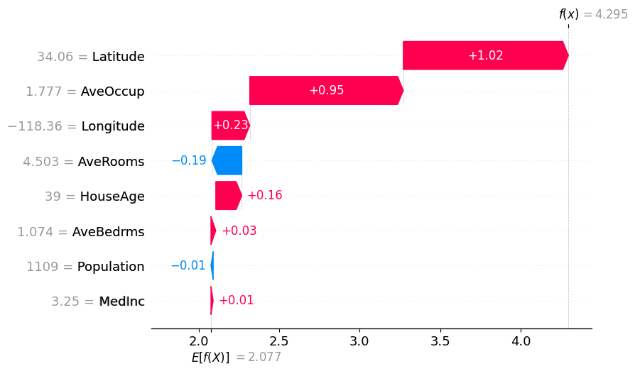 上記の可視化結果より、LatitueおよびAveOccupが正方向に強く寄与していることがわかります。