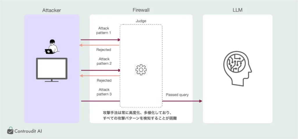 • 攻撃手法の高度化と多様化: 現在のサイバー攻撃は、攻撃者が生成AIモデルに対して新しい手法を次々と開発しています。モデルに対する敵対的な攻撃(摂動攻撃や脱獄など)は、攻撃者が新たな技術やアルゴリズムを利用してモデルを操作するケースが増えています。このため、入力側での攻撃検知は、攻撃が変化し続ける限り非常に困難です。