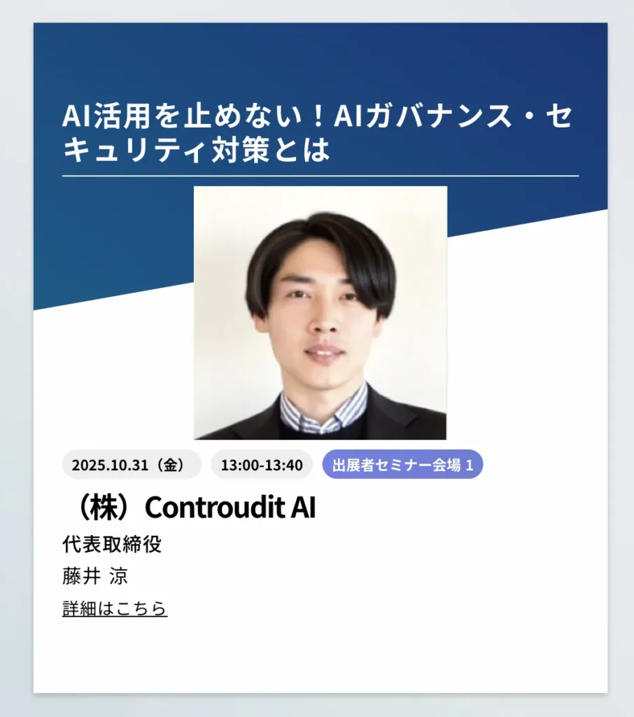 展示会3日目 10月31日(木)13:00-13:40に弊社代表の藤井が「AI活用を止めない!AIガバナンス・セキュリティ対策とは」と題して、AI時代における企業の競争力を強化するためのガバナンスのあり方をプレゼンします。