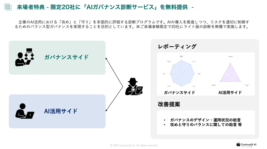 展示会ブース(S08-25)にお越しいただいた企業様のうち、先着20社限定で「AIガバナンス診断サービス」を無料提供いたします。貴社のAI活用状況やリスク管理体制を短時間で可視化し、改善提案をフィードバックいたします。AI導入を検討中の企業様、ガバナンス体制を強化したい企業様はぜひこの機会にご相談ください。