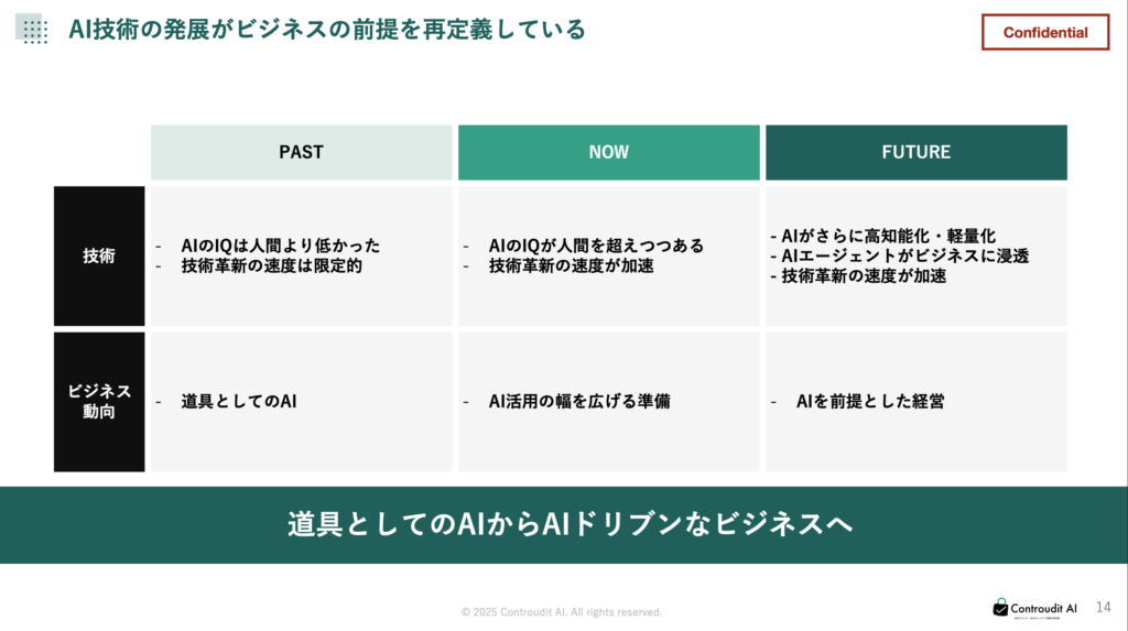 講演の冒頭では、生成AI・大規模言語モデル(LLM)の登場によって、企業活動がどのように変化しているかをご紹介しました。ChatGPTをはじめとする生成AIは、リリースからわずか数か月で世界的に急速に普及し、従来のIT普及曲線を大きく上回るスピードで企業の現場に浸透しています。かつては一部の専門家だけが扱っていたAIが、今ではあらゆる職種が活用できる「業務インフラ」へと変わりつつあります。