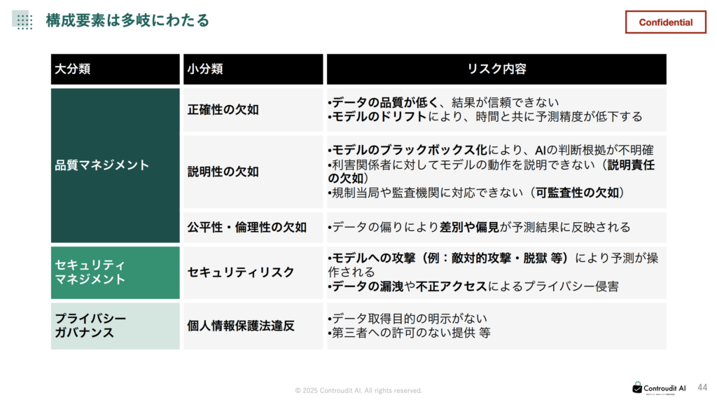 一方で、AIの急速な導入によってリスクも顕在化しています。データ品質の問題、バイアスの混入、説明可能性の欠如、誤情報生成、モデルの安全性、運用プロセスのブラックボックス化など、従来のIT監査では十分に捉えきれない課題が発生しています。講演では、こうしたリスクの代表例を挙げつつ、それぞれのリスクが企業の信用・業務プロセス・安全性にどのような影響を及ぼすのかを整理しました。